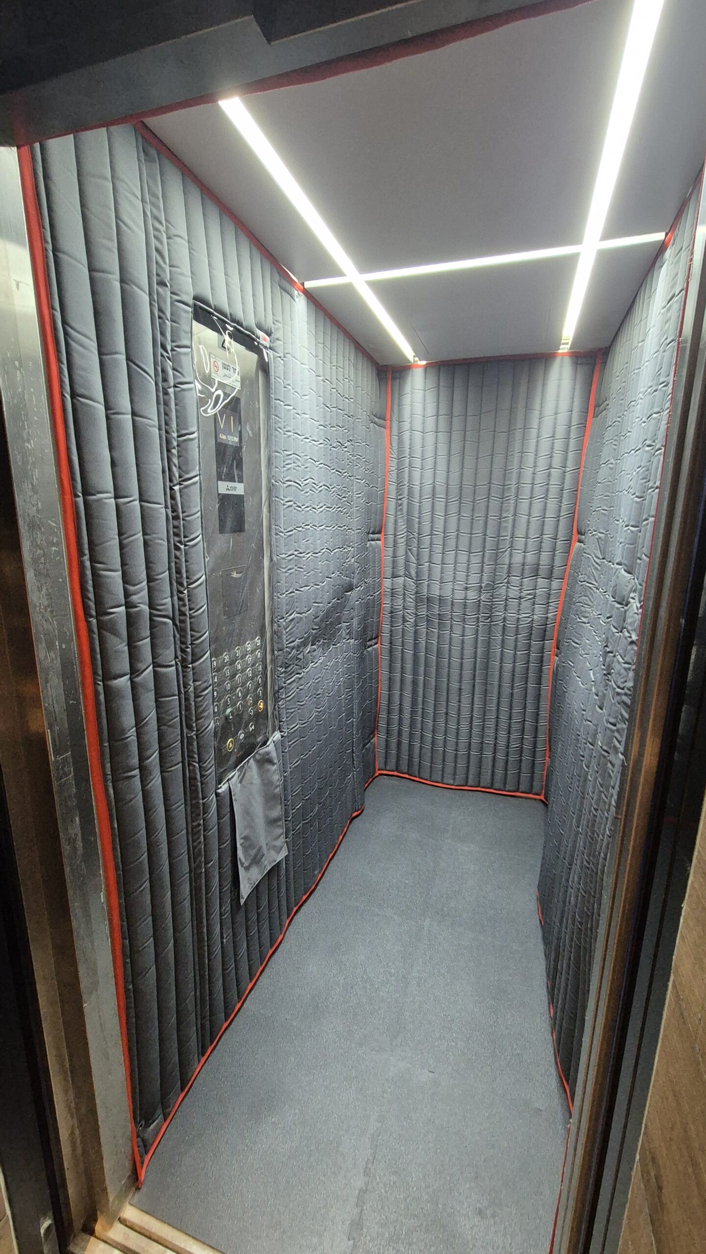 כאשר מדובר במיגון בד רב פעמי – אנו מגיעים לקחת מידות מדויקות, ואלה נשלחות למתפרה מקצועית שתופרת חליפה מדויקת למעלית, אשר מתלבשת בדקות בודדות על פינים קבועים שהתקנו עבורכם במעלית.